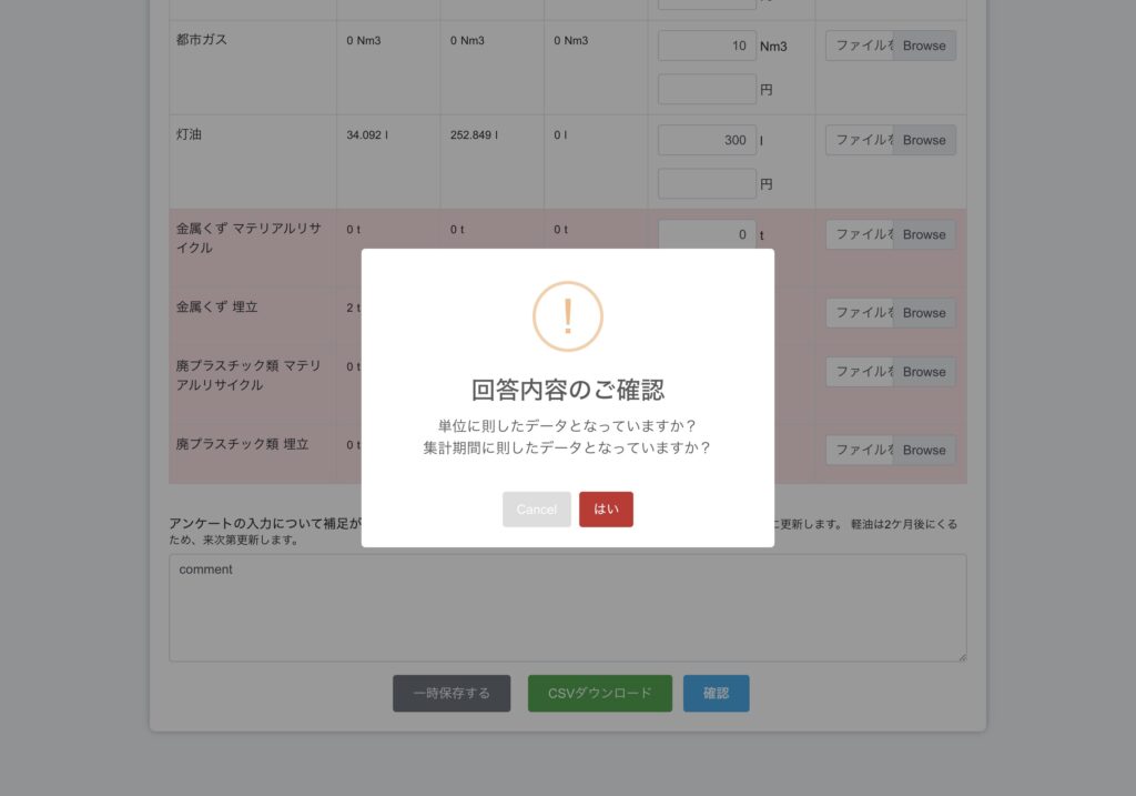 回答が完了したら確認を選択すると確認画面が表示されるので、問題無ければはいを選択。