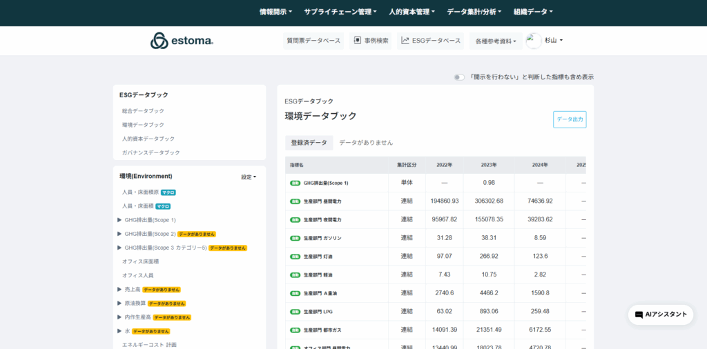 データブックの使い方 ESGデータベース > ESGデータブック 総合・環境・人的資本・ガバナンスデータブックを確認可能。 データ出力を選択するとCSVデータが取得可能。 Updated on 1月 31, 2026 Was this article helpful? Yes No Related Articles ESGデータベース画面の使い方 集計したデータのダッシュボード機能 アンケートの複製方法 配信時のメール内容の変更方法 漏れてしまった事業所の追加方法 回答データのダウンロード