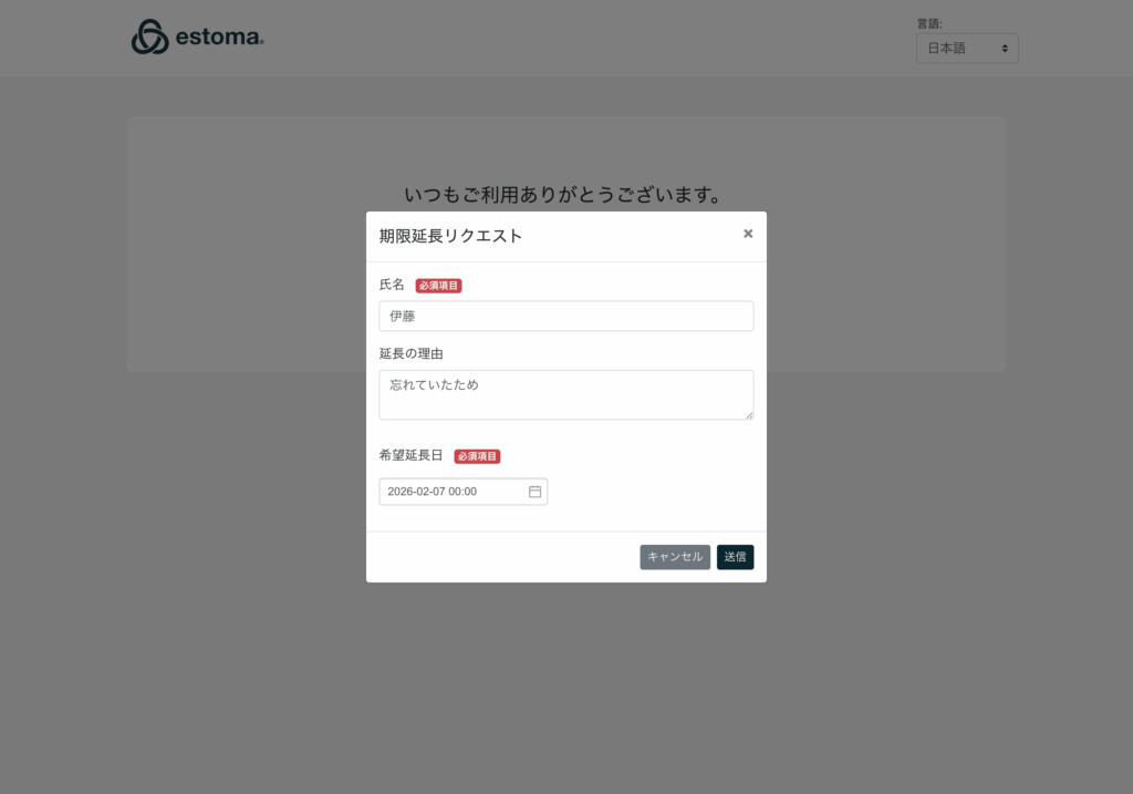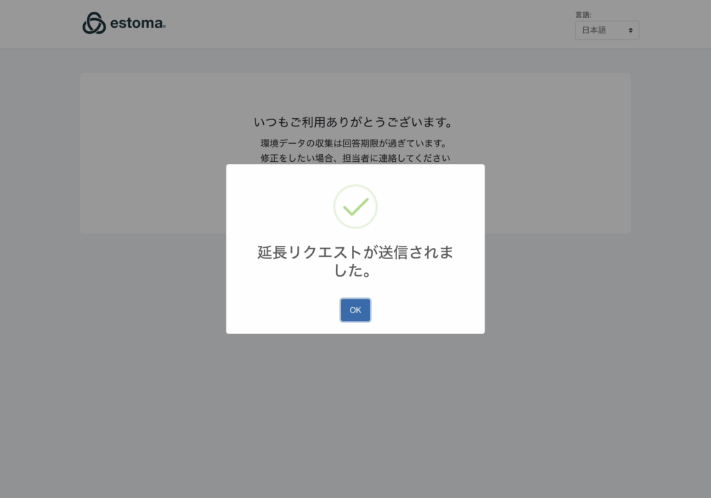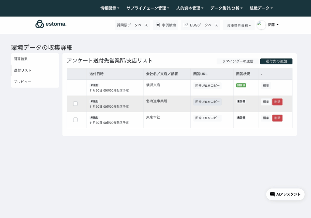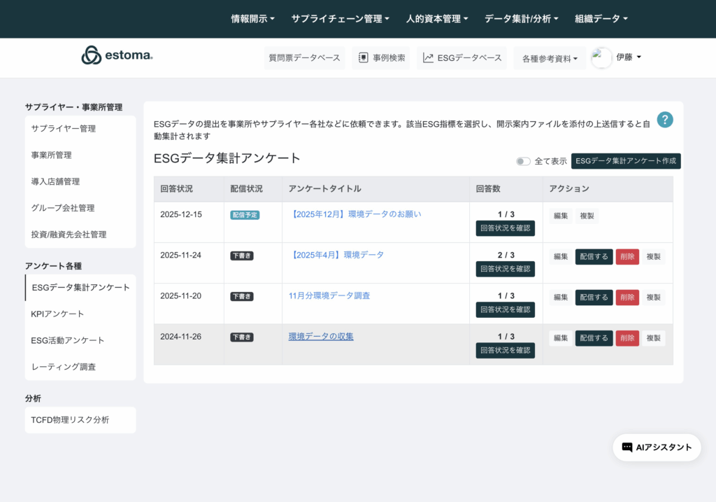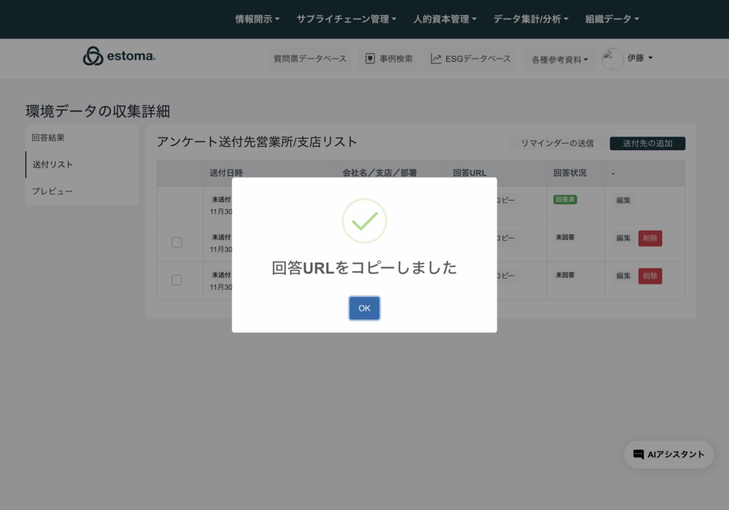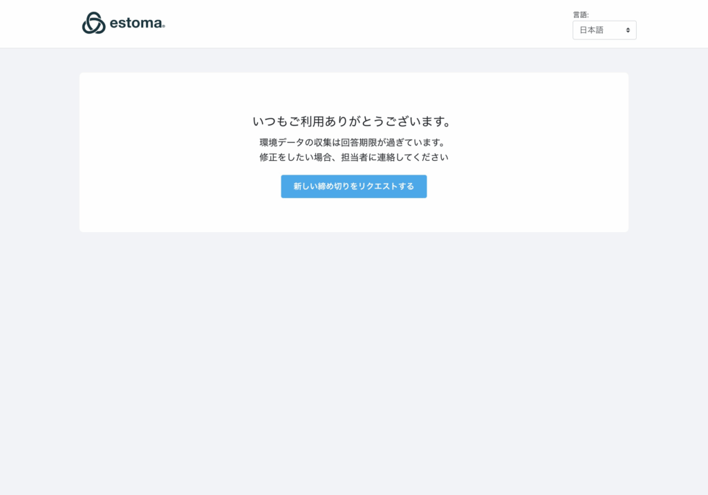 回答期限が切れてしまった時の対処方法 データ集計/分析 > データ集計アンケート を選択 サイドカテゴリのESG集計アンケートを選択 送付リストを選択して該当する回答URLをコピーを選択 ブラウザでURL検索し、新しい締め切りリクエストを選択。 期限延長リクエストに記入して送信。 Updated on 1月 31, 2026 Was this article helpful? Yes No Related Articles データブックの使い方 ESGデータベース画面の使い方 集計したデータのダッシュボード機能 アンケートの複製方法 配信時のメール内容の変更方法 漏れてしまった事業所の追加方法