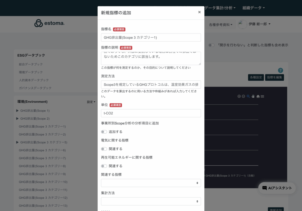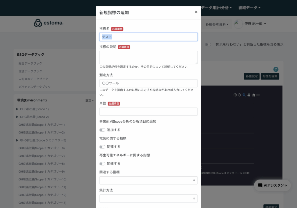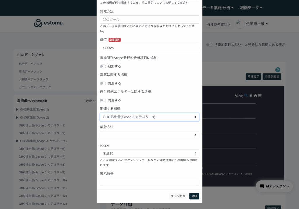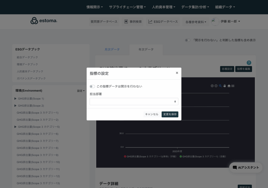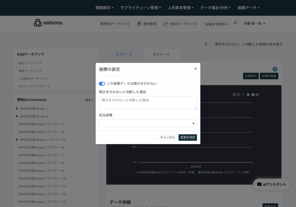 指標データは開示を行わない設定や、理由を記載し、担当部署の選択が可能。